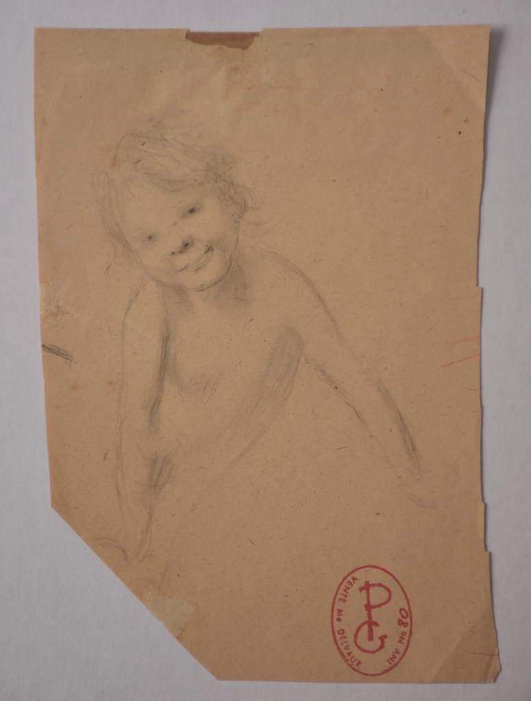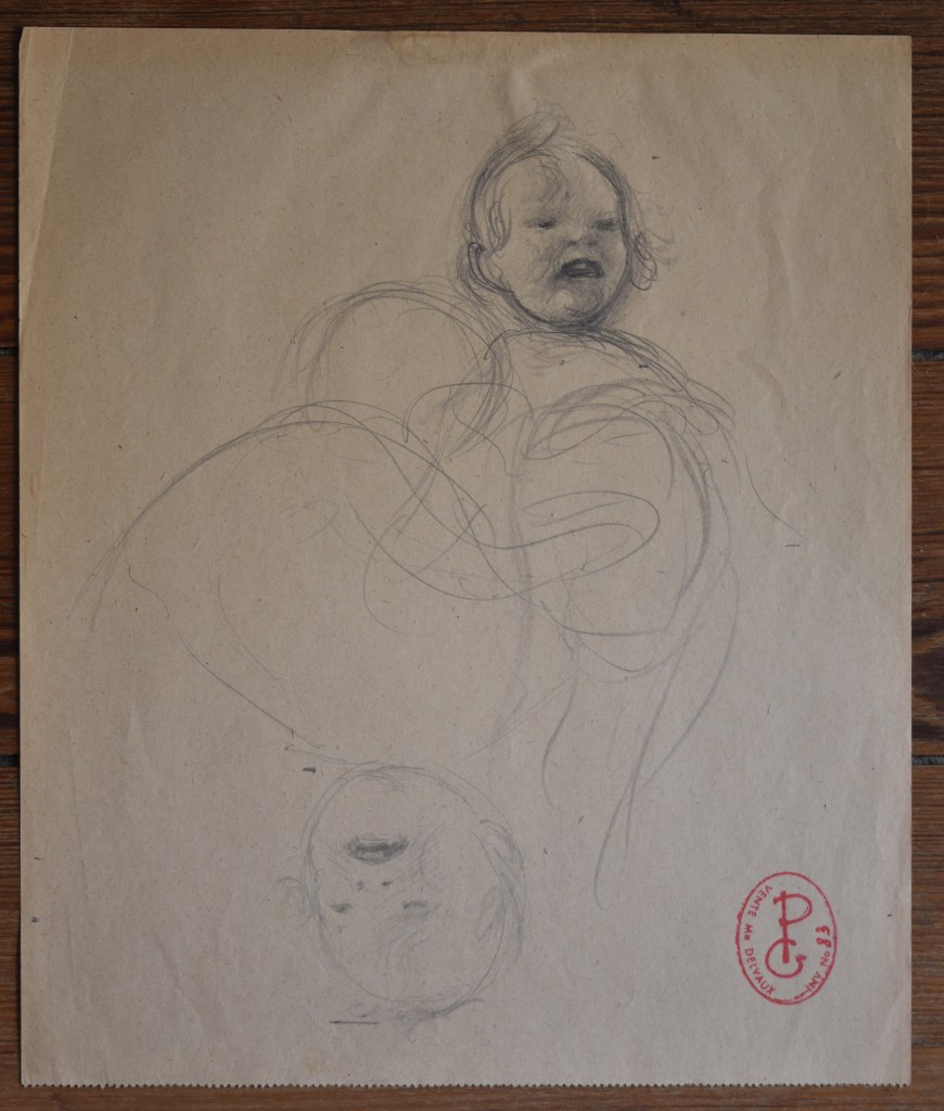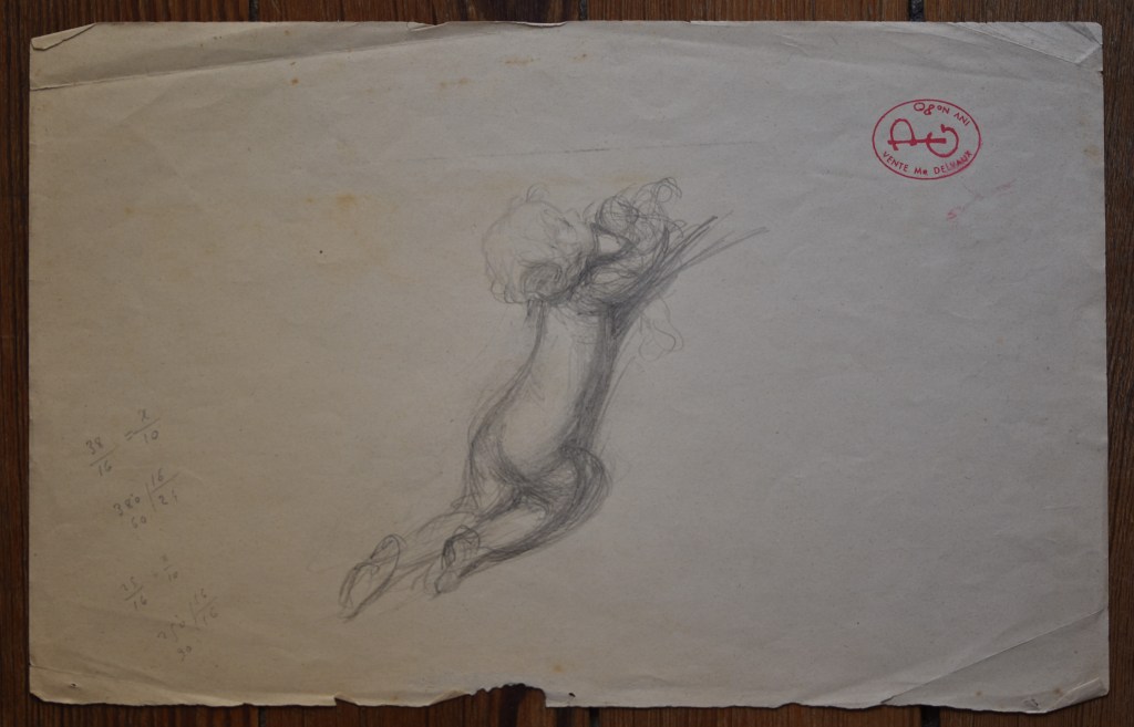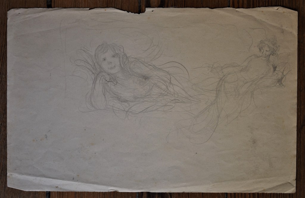Dessin double face : recto ; Enfant flotte dans l’air (peut-être souffle quelque chose), verso ; Esquisses de femmes