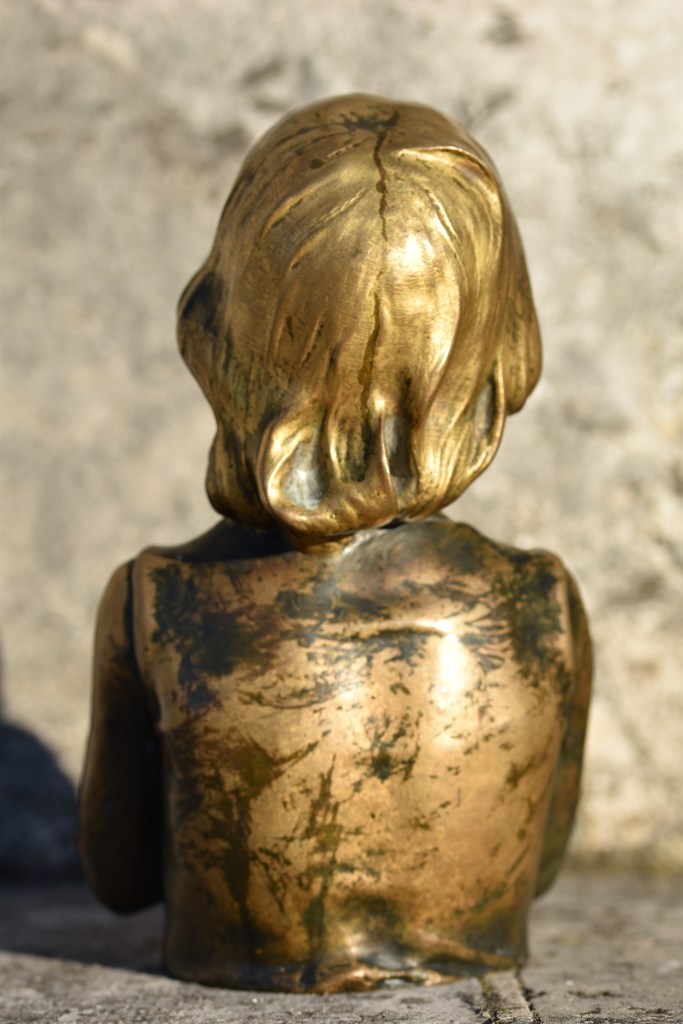 Le modelage de cette mi-figure d’une jeune fille priante est très beau et la fonte est belle aussi. Non signée, le style rapelle un peu cela de Raoul Larche. Usures à la dorure.