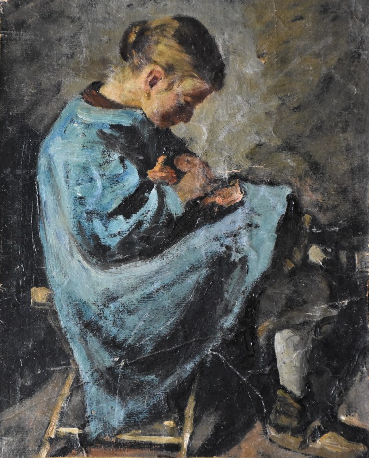 Œuvre non signée, peut-être une esquisse plutôt qu’un tableau terminé, on pense instinctivement sur le peintre lyonnais Joseph Bail (1862-1921), célébré pour ses thèmes rustiques, du travail, et de l’absorption. La concentration de la fille, les mèches de cheveux, les petites touches jaunes de la boucle d’oreille, tous sont exceptionnels.