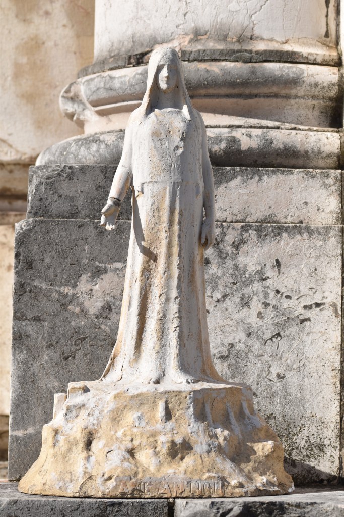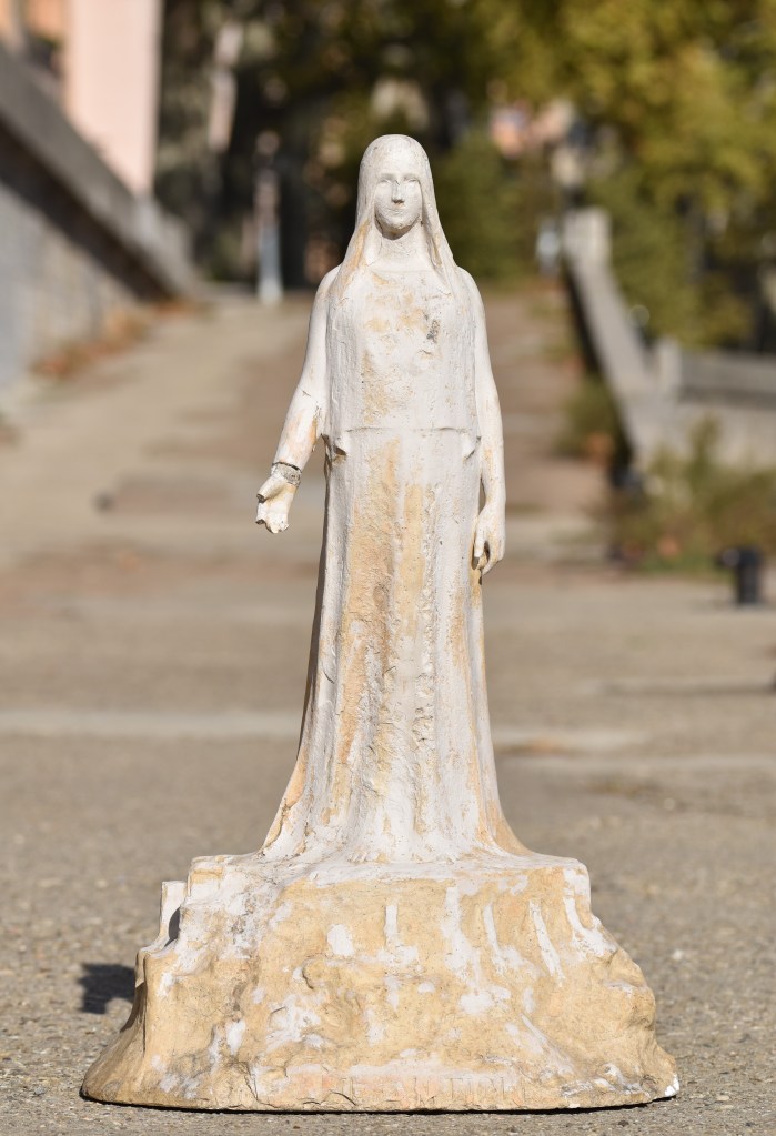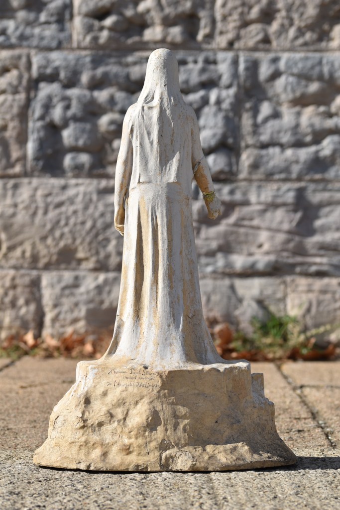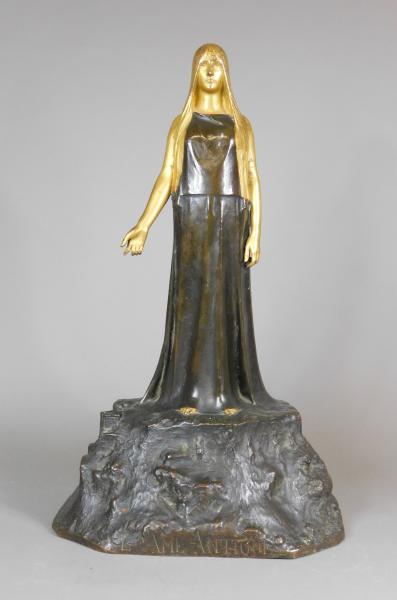 Attirant fantasmagorie par Grégoire Calvet avec une femme géante et spirituelle vêtue dans une longue robe debout, presque planer, sur le mont de l’Acropole. Le dos porte une dédicace du sculpteur à un certain Paul Stuart : A monsieur Paul Stuart / amical souvenir / De L’Acropole d’Athènes. Paul Stuart (1861-1914), son vrai nom Paul Aimé Stuardi, d’origine lyonnaise, était chanteur, poète, metteur en scène, et régisseur général de l’Opéra de Paris. Avec cette dédicace il me semble qu’il y a peut-être un lien entre cette vision de Calvet et une mise en scène d’un opéra de l’epoque. Un plâtre de L’âme antique, peut-être celui-ci, fut exposé au Salon de 1899, et il y est allé une édition en bronze.