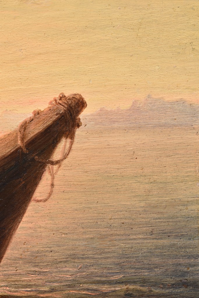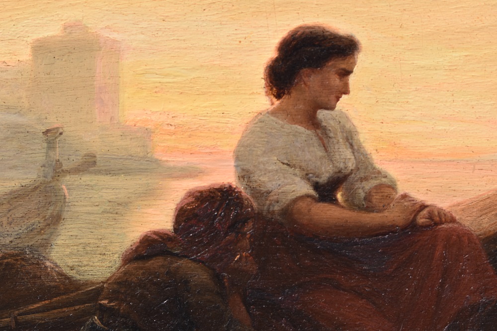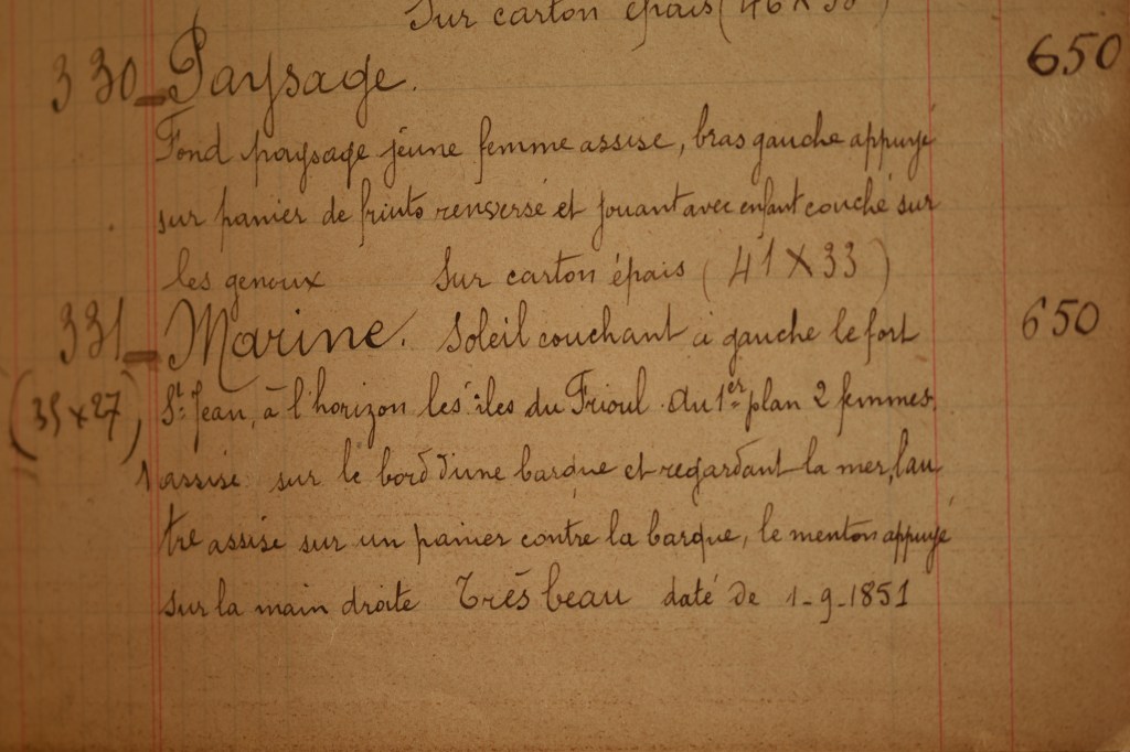 331. Marine. Soleil couchant à gauche le fort / St Jean, à l’horizon les îles du Frioul au 1er plan 2 femmes / l’[un] assise sur le bord d’une barque et regardent la mer, l’au/tre assise sur un panier contre la barque, le menton appuyé / sur la main droite très beau daté de 1.9.1851*