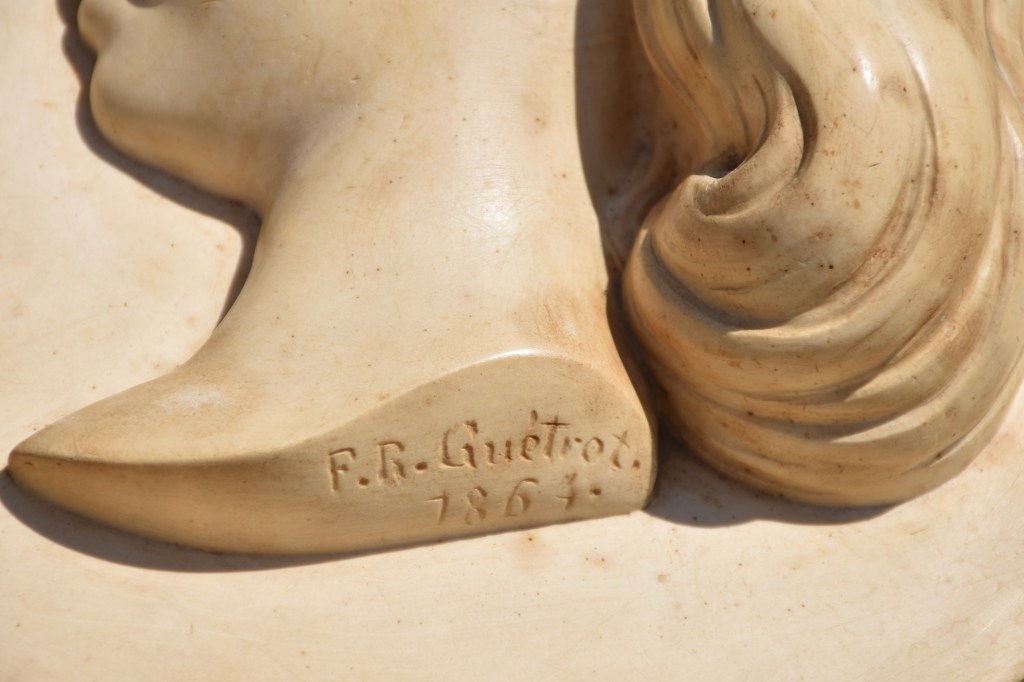 Évitant la métropole François-René Guétrot vécut et travailla à Niort. Néanmoins il fut largement célébré surtout pour ses bas-reliefs en plâtre. Ce charmant profil d’une fille avec un bandeau dans les cheveux fut exposé au Salon de Paris en 1864 : « No 2636 – Portrait de Mlle M. F… ; médaillon, plâtre. »