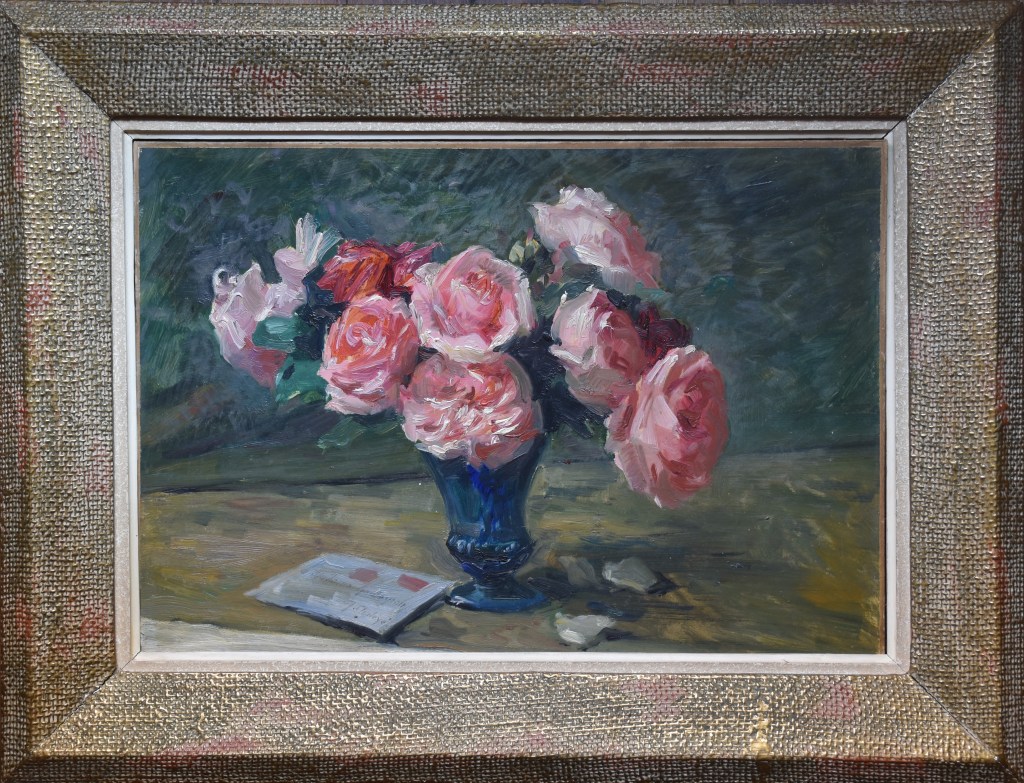 Jean Chaleyé was one of the most important textile designers and flower painters in France in the first half of the twentieth century. He was born in Saint-Étienne, an industrial city situated 60 km to the southwest of Lyon. Although known as Lyon’s sister city, Saint-Étienne is culturally quite distinct and there has always been a fierce rivalry between the two. Chaleyé studied first at the School of Industrial Arts in Saint-Étienne before winning a scholarship to study at the Lyon School of Fine Arts and its highly regarded ‘Flower Class’. The ‘Classe de fleurs’ at the Lyon Art School emerged out of the need to form talented flower designers for the important silk industry in the city. After three years in Lyon, Chaleyé won the Prix de Paris which provided him with a grant for further study in Paris, and he entered both the Paris School of the Decorative Arts and the Paris School of the Fine Arts, effectively following a twin path as an industrial designer and as a fine artist. Towards the end of his time at art school in Paris he was recruited by the French government to oversee reform and to revive and improve design in the French lace industry. To this end, Chaleyé relocated to Le Puy-en-Velay, a beautiful and ancient town deep in the centre of France which had an established if ailing lace industry. Le Puy was also only 80 km south along the Loire River from Saint-Étienne (just over an hour on the train), so in a way Chaleyé was back home. For the next forty years he represented the French lace industry in many national and international exhibitions and trade fairs. Throughout, he remained dedicated to painting in oils, mainly still-lives of flowers and landscapes, and he exhibited regularly at Salon exhibitions in Saint-Étienne, Lyon and Paris. The Crozatier Museum (a great museum well worth visiting) in Le Puy has many still-lives by Chaleyé in their collection. On the surface there can seem a great difference between a naturalistic and colourful still life such as this with the sumptuous pink roses in a dark blue glass vase and the more abstract repeating patterns of lace design, but what the ‘Flower Class’ at the Lyon Art School highlights was that the talent and the skill to draw and paint flowers was the foundation of good textile design. Above all else, Chaleyé was a brilliant flower painter.