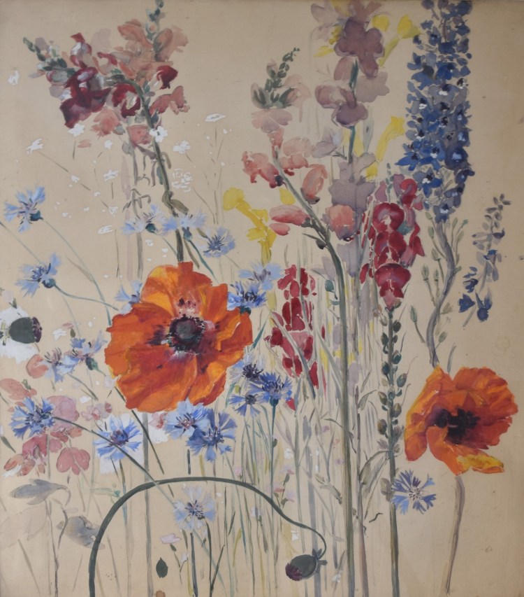 Jeannine Demay, peintre talentueuse et mystérieuse active dans les années 1910 et 1920, se spécialise dans les natures mortes. On n’est pas sûr, mais on dirait qu’elle aurait pu être lyonnaise et cette composition de fleurs des champs est peut-être liée à la Soie.