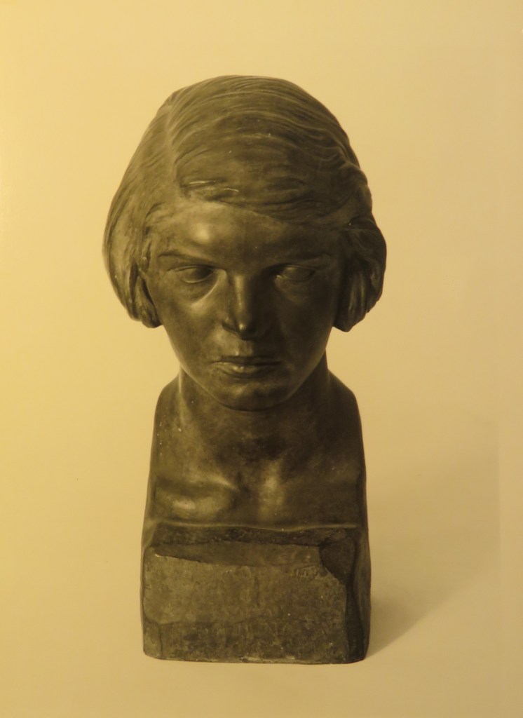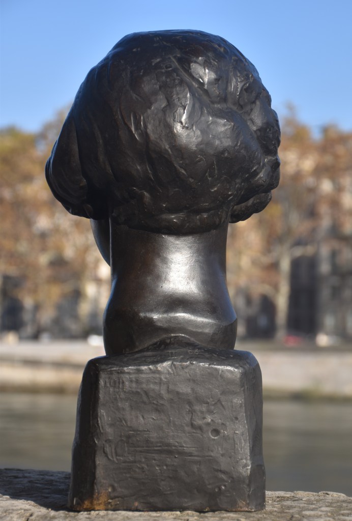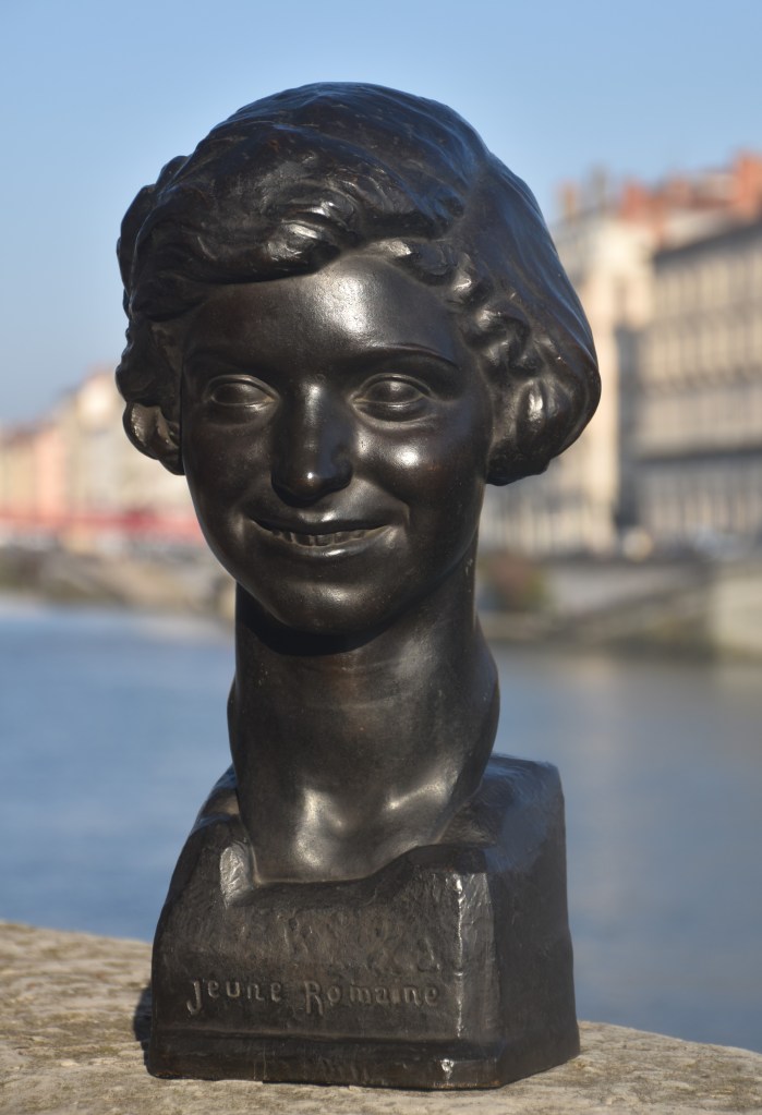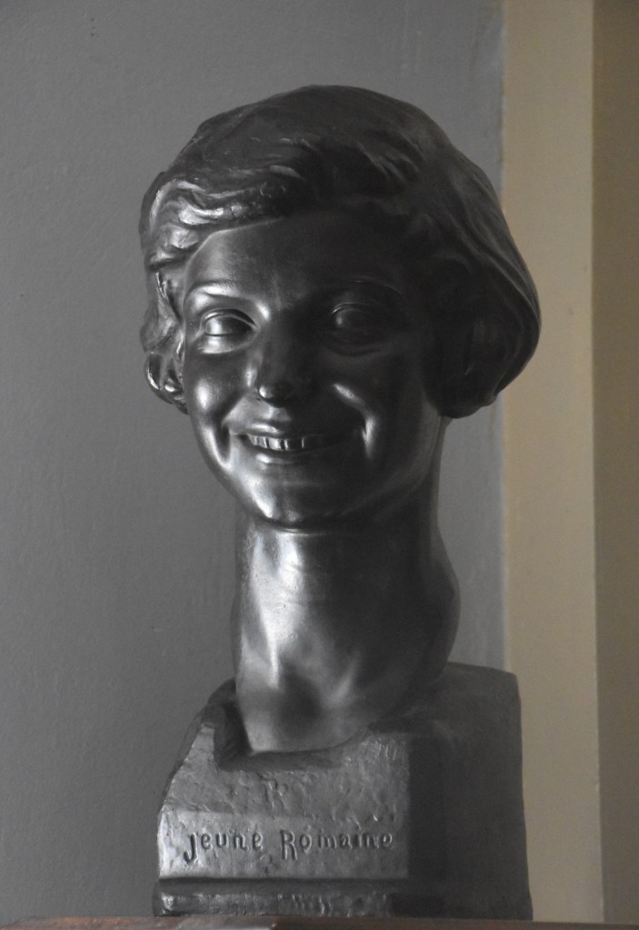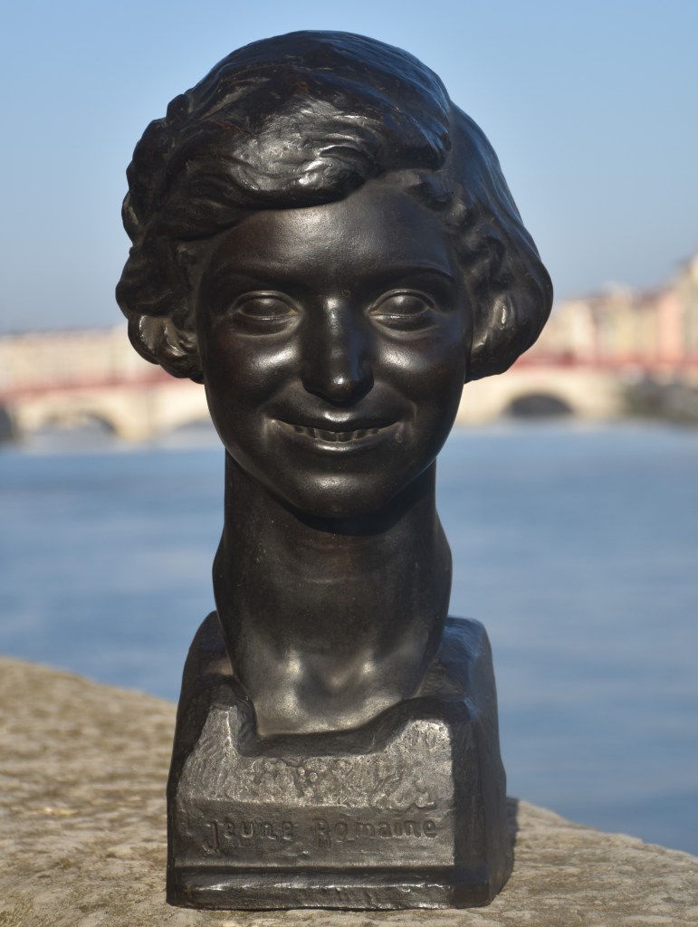 Au debout de l’année 1928, pendant ses derniers mois à Rome, Bertola a modelé une petite série de bustes d’un format similaire avec une plinthe intégrale à bords chanfreinés. Le musée des Beaux-Arts de Lyon conserve deux autres bustes en bronze, un don de madame Bertola en 1985, de ce format. A marquer son retour définitif à la France, en novembre 1928, Bertola expose un groupe des œuvres importantes au Salon d’automne de Lyon, incluant Première chasse d’Adonis et Jeune romaine. Il est certain que le buste présent, titré sur la plinthe Jeune Romaine, est le buste exposé sur ce titre au Salon de 1928. Cependant, un des bustes au musée des Beaux-Arts de Lyon représente également une jeune femme avec un coupé bob avec une raie, mais au contraire à la souriante Jeune romaine, elle a l’air boudeuse, sérieuse. Pourraient-ils être les expressions différentes de la même jeune femme ? Peut-être. Le buste de jeune femme boudeuse, qui n’est pas titré sur la plinthe, au musée des Beaux-Arts de Lyon est entré dans la collection en 1985 comme « Femme romaine » mais ensuite était identifié à tort avec la pièce exposée à l’exposition de 1928 et renommée la « Jeune romaine ». S’il est indéniable que les deux bustes sont associés, il est également clair que celui qui porte le titre Jeune Romaine sur la plinthe est effectivement LA Jeune romaine, contrairement au buste présenté au musée. La redécouverte de la véritable Jeune romaine corrige non seulement cette méprise, mais nous offre également une autre œuvre essentielle de l’une des plus belles périodes du sculpteur.