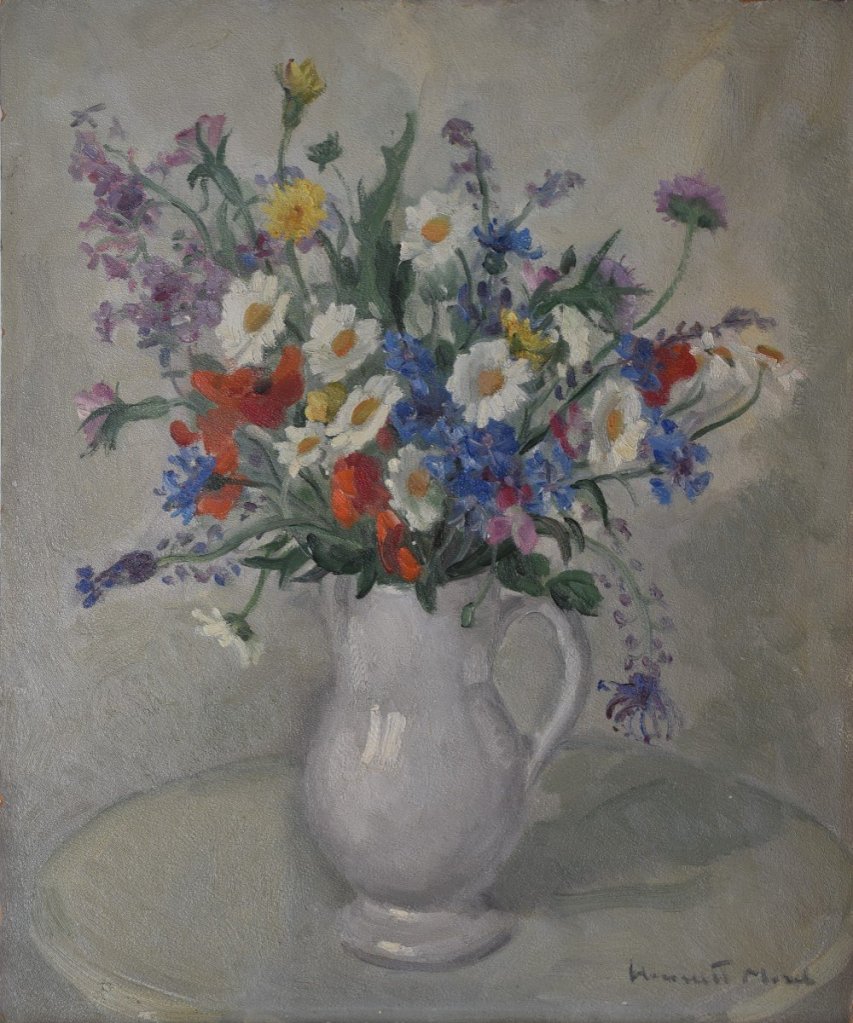 In this still-Iife of wildflowers arranged haphazardly in a vase sitting on a table, it is not only the flowers and their stems which attract the eye, but the setting itself, a beautiful piece of white-on-white painting.